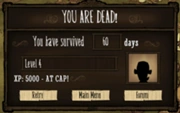 Un écran résumant la situation (cf. ci-contre) apparaît à la fin de chaque monde et montre combien de temps (en jours) le personnage est resté en vie. Chaque jour de survie rapporte 20 exp. Plus le personnage survit dans une partie, plus il y a d'expérience gagnée.