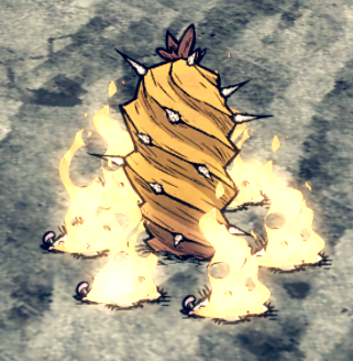 Elephant Cactus自体は不燃性ですが近くに発火物があったり炎の杖での攻撃によるダメージは入ります。また、掘り起こしたものは焚き火などの燃料にすることができますがElephant Cactusは貴重である上に再生不可能なオブジェクトであるためいたずらに消費することは推奨されません。