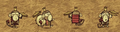 | Don't Starve | Wilson (セリフ ⋅ 衣装) • Willow (セリフ ⋅ 衣装) • Wolfgang (セリフ ⋅ 衣装) • Wendy (セリフ ⋅ 衣装) • WX-78 (セリフ ⋅ 衣装) • Wickerbottom (セリフ ⋅ 衣装) • Woodie (セリフ ⋅ 衣装) • Wes (セリフ ⋅ 衣装) • Maxwell (セリフ ⋅ 衣装) • Wagstaff (セリフ ⋅ 衣装) |
