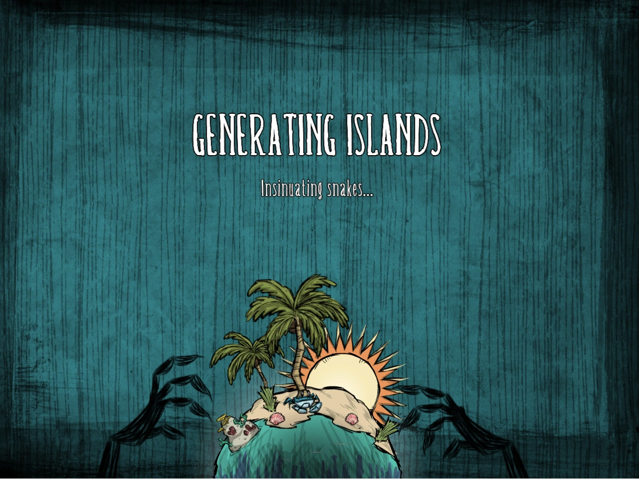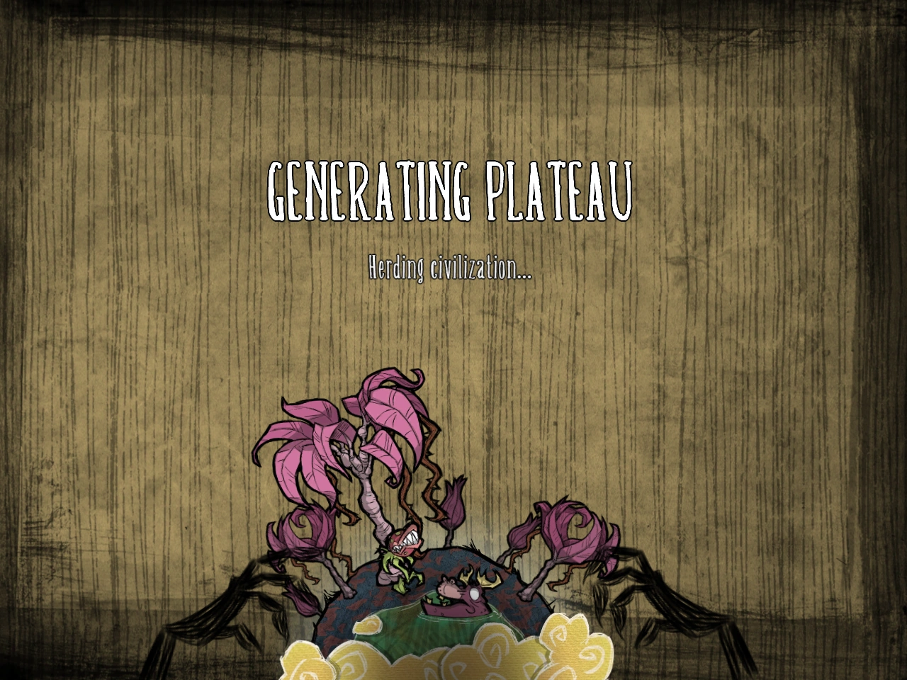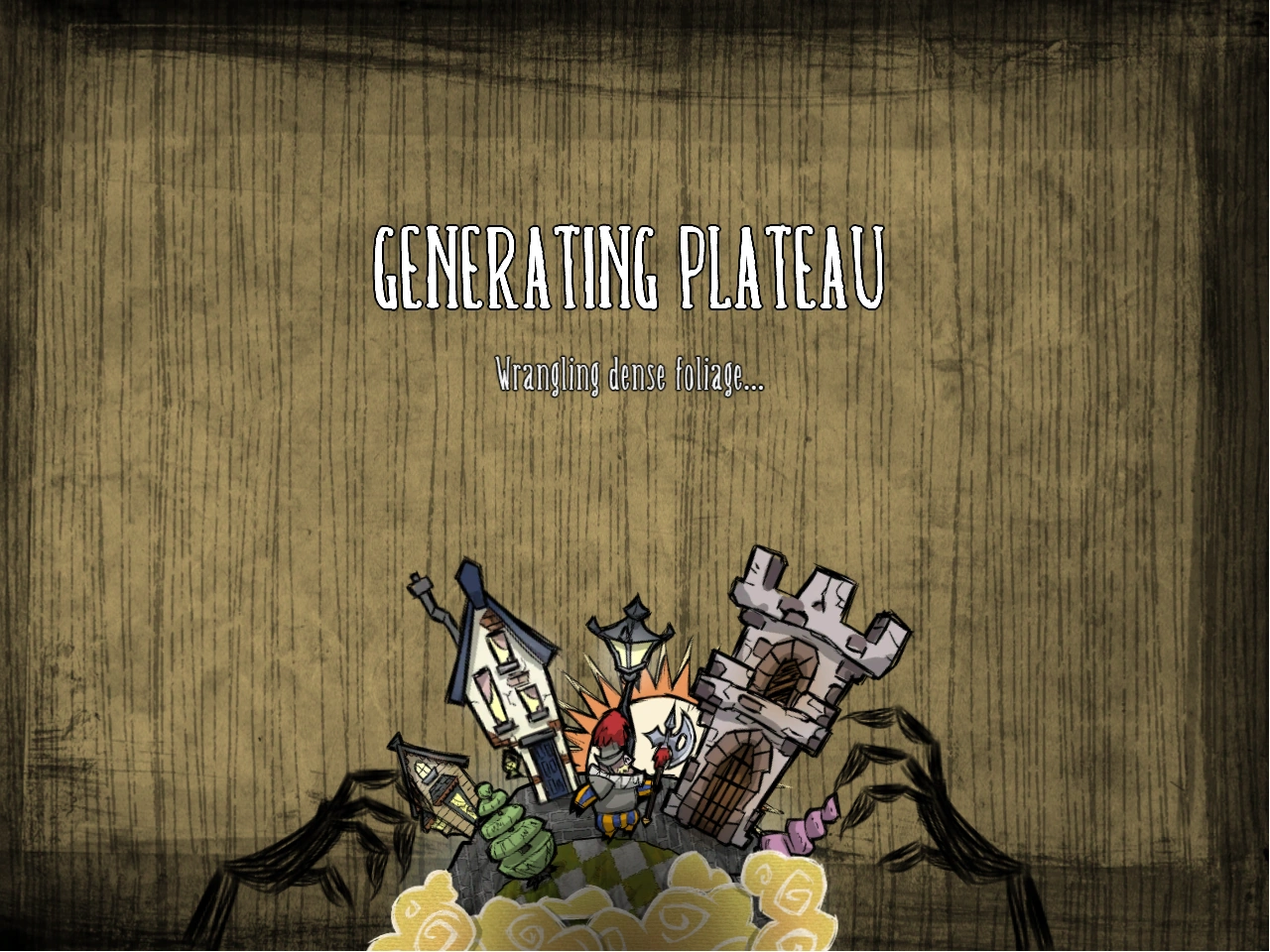 Экран при генерации мира — это переходная/загружающая часть между выбором персонажа и игрой. В ней мы видим чёрные руки, дрожащие над маленьким земным шаром, на котором изображены игровые объекты. Загрузка мира сопровождается короткими шутливыми фразами, такими как "Разгоняем монстров" или "Генерируем бороду Уилсона".